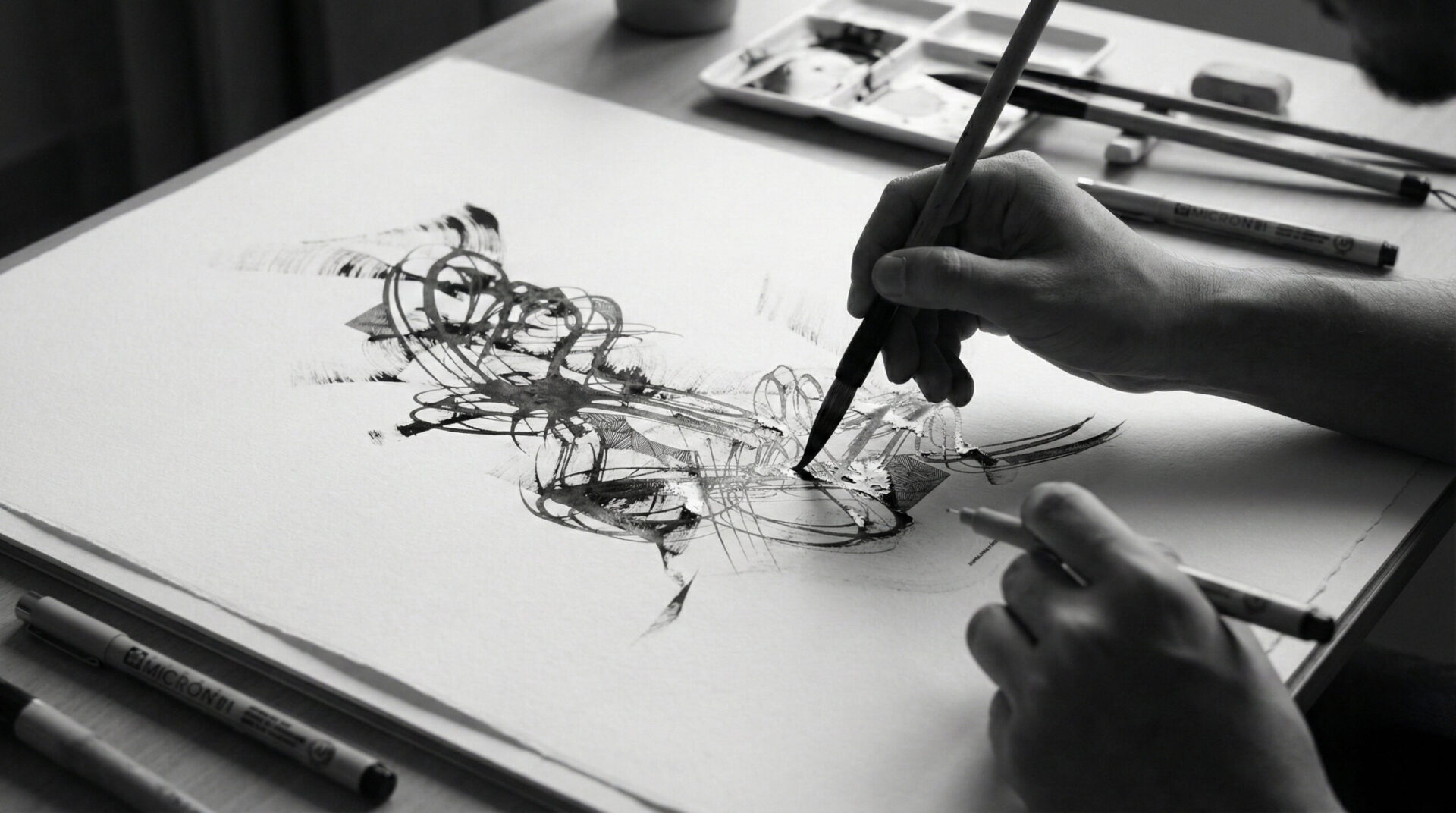 筆と墨の濃淡、線の重なり、余白の呼吸。